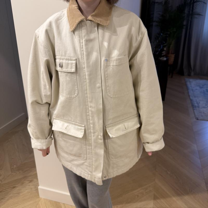 Бежева котонова куртка з підкладом, на весну-осінь. Дуже зручна, оверсайз фасону. На куртці світло-коричневий контрастний ворот , тому куртка дуже стильна та сучасна, купувала в тому році, носила 3-4 рази тому на ній зовсім немає нюансів чи пошкоджень.