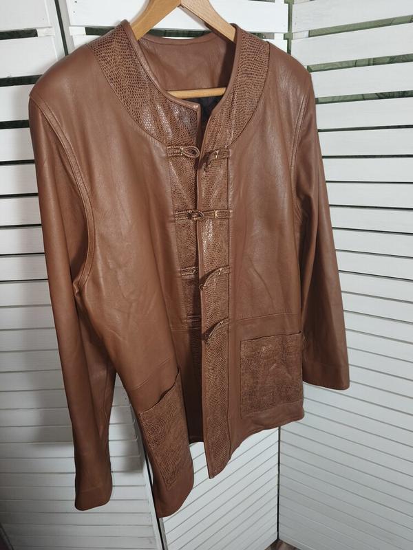 Шикарная вещь в прекрасном состоянии! кожаная куртка (подкладка по уровню талии), средний коричневый оттенок. отделка под рептилию. на воротнике есть потемнение - Надо зачищать, золотые детали несколько потемнилы, но в целом очень классное состояние. мягкая эластичная кожа! Длина 75 пог58 ширина плеч 46 (имеют тонкий подплечник вшитый) рукав 66 и можно подворачивать