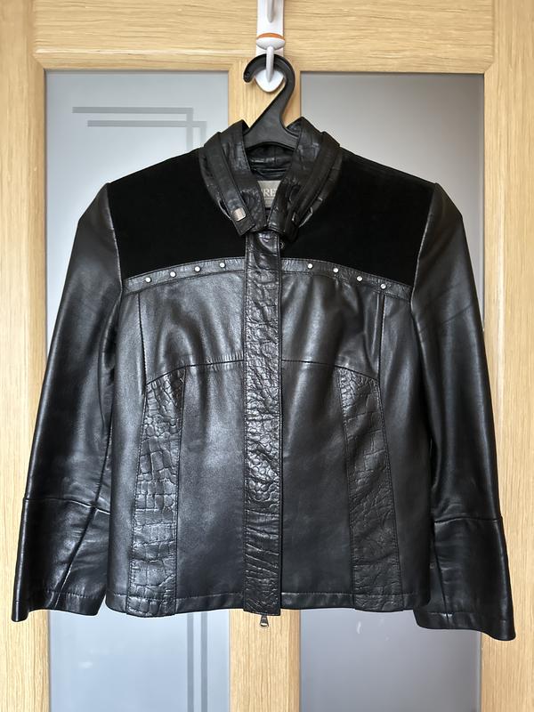 Ног 45 Нот 42 Довжина 55 Плечі 41 Рукав від плеча 54 Без дефектів! Шкіряна куртка в комбінації з натуральною замшею та принтованою шкірою. Ворот - стойка Застібка - двостороння блискавка , + зверху кнопка.