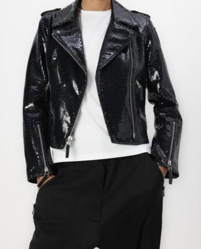 женская черная куртка-косуха из лакированной искусственной кожи от бренда Topshop. eBay UK eBay UK Особенности изделия: Стиль: Классическая байкерская куртка (косуха) с асимметричной застежкой-молнией. Материал: Искусственная лакированная кожа с глянцевым эффектом и характерной «жатой» текстурой. Детали: Широкие лацканы и воротник на кнопках. Функциональные боковые карманы на молниях и один небольшой накладной карман с клапаном на кнопке. Молнии на манжетах рукавов. грудь 88 низ88 длина 54