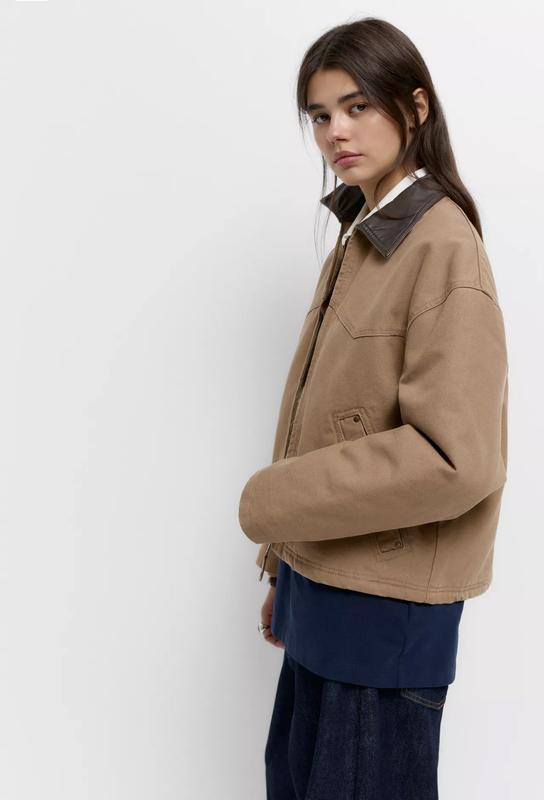 Жіноча куртка Pull&Bear з комбінованим коміром зі штучної шкіри, кокеткою, бічними кишенями та блискавкою. Утеплена мʼяким барашиком всередині. Колекція Pacific Republic