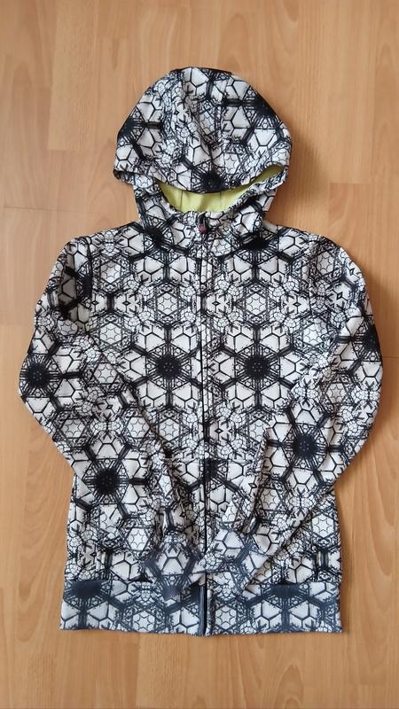 Куртка софтшелл, не промокает, не продувается. На флисовой основе. Современный и привлекательный дизайн. Геометрический принт черно-белого цвета. Встроенный капюшон. Застежка-молния спереди. Боковые карманы. Размер С, замеры на фото