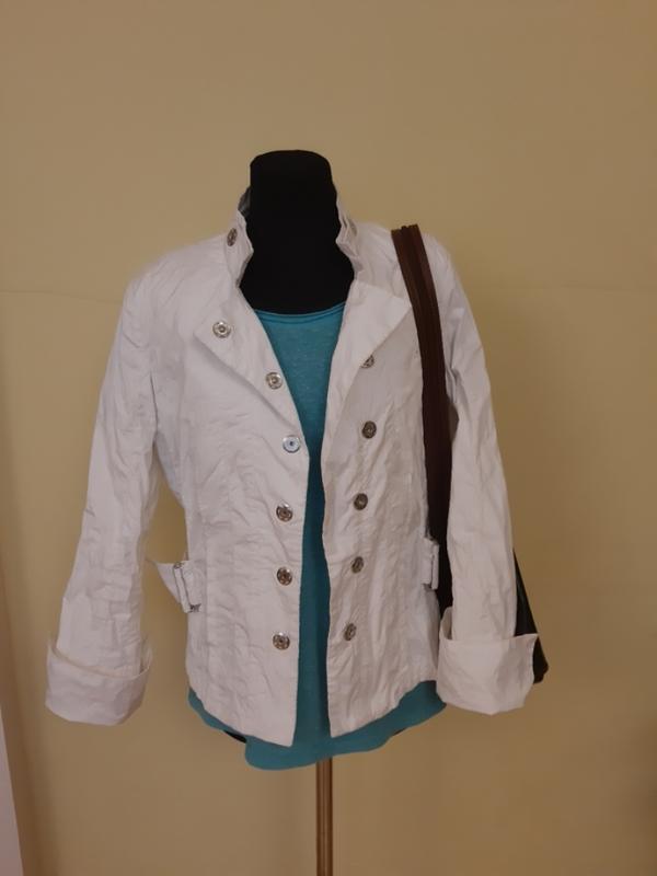 Легкая летне-весенняя куртка ветровка пиджак от немецкого люксового бренда Air Field.Цвет белый материал фактурный.Воротник стойкана кнопках+ декоративные кнопки на косой застежке .сбоку регулировка пояса пряжками..Раз.36-38 Замеры ПОГ 46 ПОТ 44-45 ПОБ 48 Длина 57 Рукав от горловины 65 8 манжет По плечам 38 см