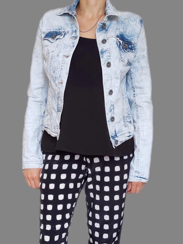 Женская джинсовая куртка с варёным эффектом от New Look. Классический покрой. Ткань тянется. Состояние отличное. Размер указан: 12uk /40 euro (подойдёт на M, M/L) Цвет: Голубой с синим Замеры: Длина от плеча - 55 см Ширина плеч - 40 см Длина плеча - 12 см Длина рукава - 65 см ПОГ - 47 см ПО низа - 46 см.