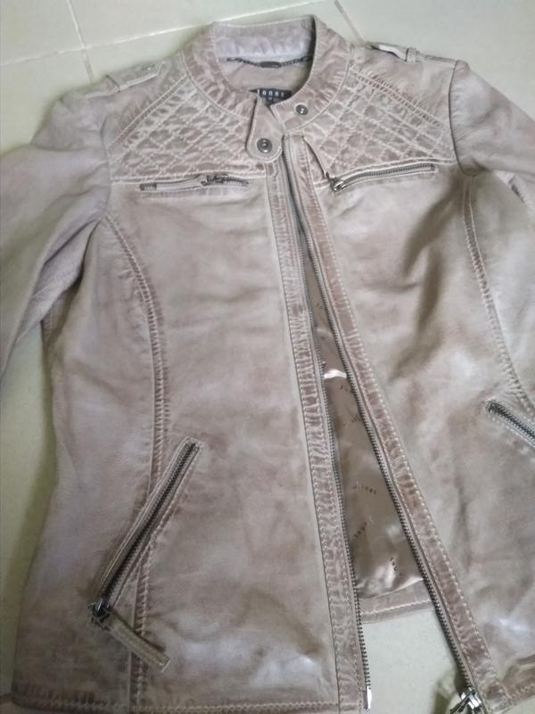 Кожаная стильная куртка В ИДЕАЛЬНОМ!! состоянии Очень мягкая кожа!! С двумя кармашками по бокам И два кармана на замках с верху Цвета капучино Д-60см Рукава - 61см Полуобхват - 51см Плечи - 38см Талия - 44см Низ-46см
