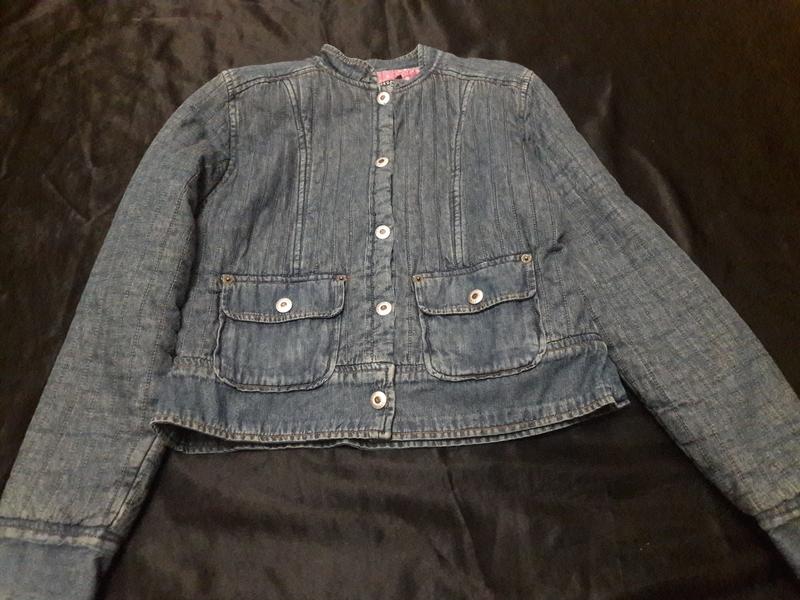 Джинсовая стеганная куртка. Франция, бренд Morgan. Достаточно теплая за счет синтепона. Плечи 40 см. Ширина спинки 48 см. Длина 53 см. Длина рукава 62 см.