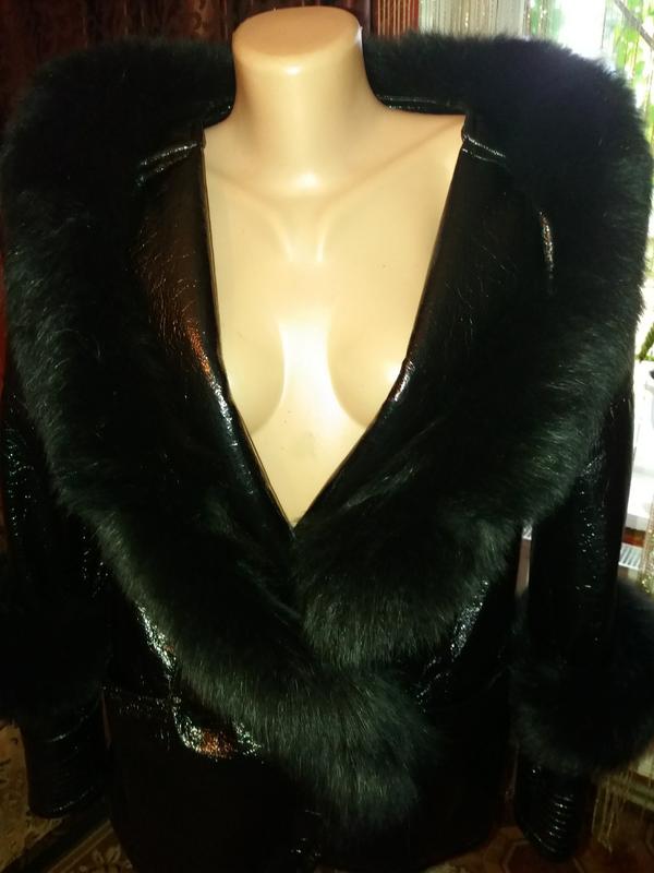 Куртка чёрная.На запах. Кожа искусственная, лаковая.Мех натуральный. мех отстёгивается. размер 52.об.груди 112.об.бёдер 114.длина 70.плечи 46.рукав 63.