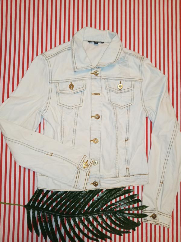 Джинсовая куртка бледно-голубого цвета на пуговицах, немного рваная и потёртая