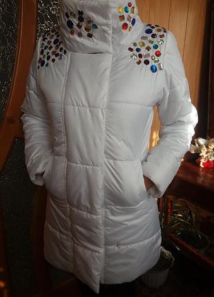 Куртка біла з камінням. Нова. Розмір С. Невеличка М . Легенька в зручна . Довжина 83 див Рукав - 60. Грудей 48. В талії 45. Низ - ширина-55.