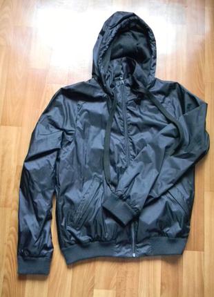 Ветровка с подкладкой, размер S, на 36-38.Длина 58 см, в груди 46 см, длина рукава 62 см, плечи 37 см.Капюшон не съемный, подворачивается и прячется под воротник на липучке, карманы на замках.