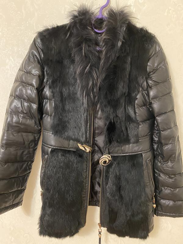 Куртка из эко-кожи утеплённая с натуральным мехом кролика спереди и песцовым воротом. Рукава отстегиваются и делается жилеткой. Указан размер L, маломерит. Идёт на S-M