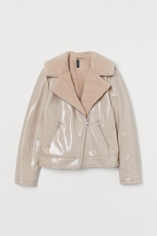 Байкерская куртка из искусственной лаковой кожи с подкладкой из искусственной овчины. Прорезные лацканы, диагональная молния спереди и боковые карманы на молнии.