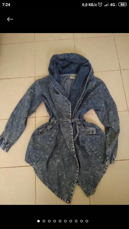 Новая! очень стильная джинсовая куртка С капюшоном Застёгивается на запах, сзади широкая резинка и шнуровка По бокам два кармана Спереди длиннее, сзади короче