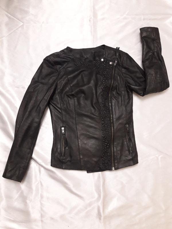 Шкіряна куртка - косуха. Бренд Naf Naf. ПОГ 43 см, ПОТ 35 див Довжина 52 див. Рукав 58 див. була місцями витерта фарба, підфарбована в ательє.