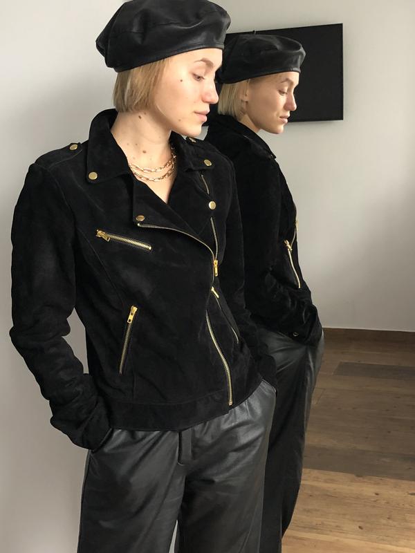 Косуха из натуральной чёрной замши с золотой фурнитурой, цвет насыщенный, смотрится шикарно, по ощущению кожа мягкая и легкая Размер S, M Состав натуральная замша Цена 1200 грн