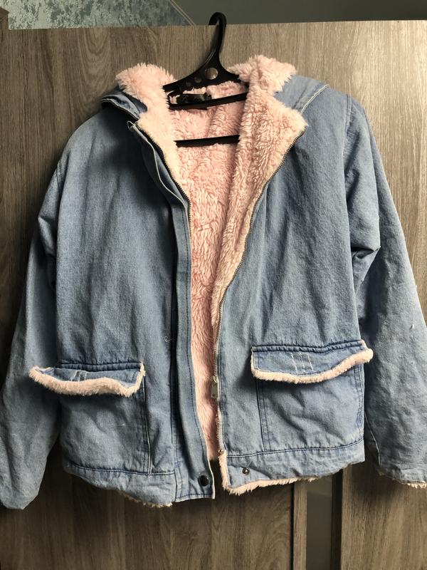 Стильная джинсовая куртка на искусственном меху, есть капюшон и карманы, размер М ПОГ 54, длина 60, длина рукава 60