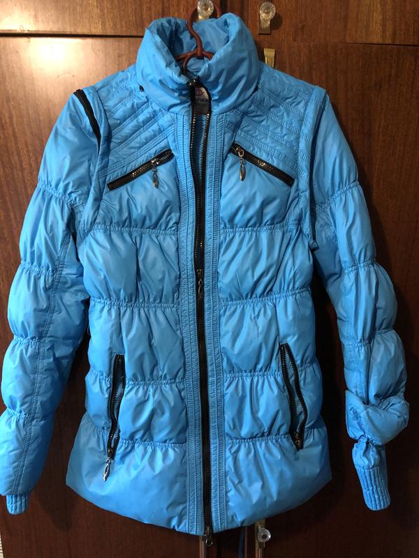 Куртка-жилетка на молнии, есть карманы на груди и на бёдрах, рукава пристёгиваются на молнии (одна молния плохо работает), капюшон крепится на кнопки, на капюшоне натуральный мех кролика. Размер S ПОГ 48, длина 70