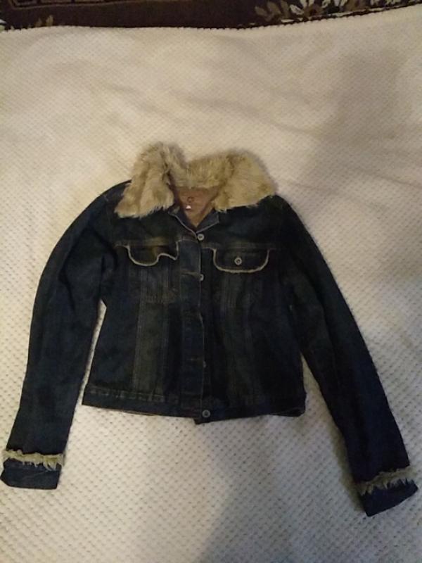 джинсова куртка розмір S/M ширина в плечах 42 см довжина 48 см рукав від шиї 72 см