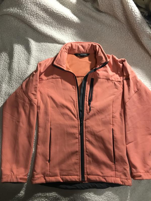 Куртка бледно-оранжевого,персикового цвета;95% полиэстер;5% эластин;воротнике под змейкой капюшон, рукава застёжка-липучки.Длина:65 см;ПОГ 47 см;реглан рукав от шеи 73 см;карманы змейка 15 см;талия 43 см;низ 47 см