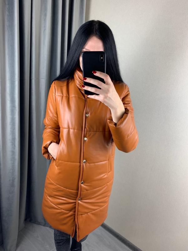 Размеры: 42-44, 46-48, 50-52 Материал: эко-кожа , синтепон 200 Цвет: чёрный , карамель Куртка застёгивается на кнопки