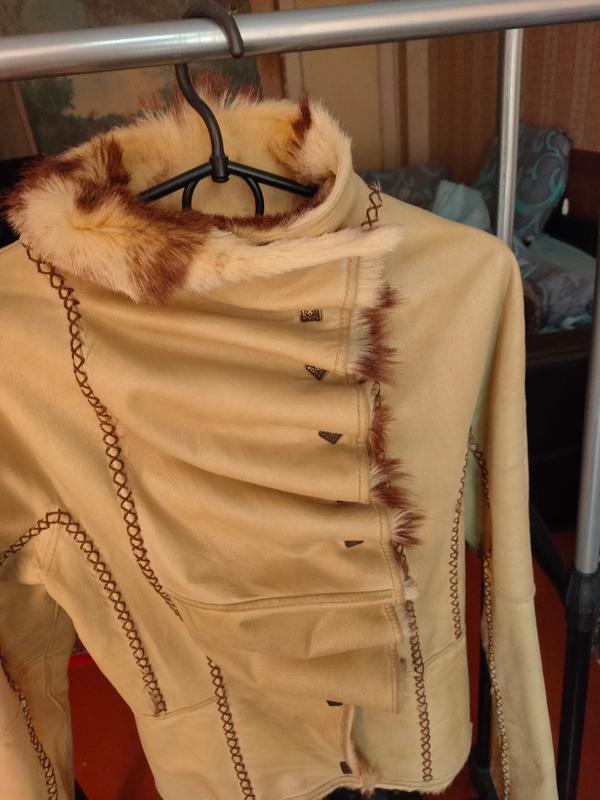 Коротенька дублянка. Натуральна шкіра та хутро. Шкіра м'яка. Елегантна застібка на кнопках. Довжина 57 пог 40 побіди 44 рукав 62.Можете перекрасить в будь який колір.