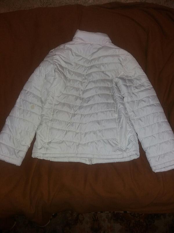 белая курточка с двумя почти не заметными пятнышками на локте и с небольшим зашитым местом на куртке, его практически не видно. В целом в глаза не бросается.