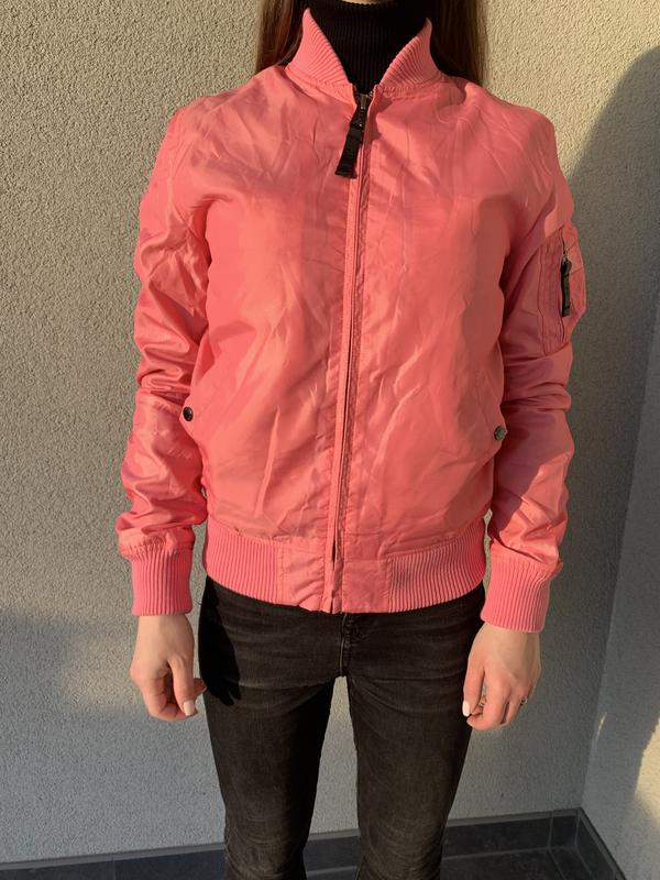 Гарненький жіночий бомбер від Alpha Industries в яскравому рожевому кольорі. Є дві внутрішні кишені і дві ззовні на кнопки, також є кишеня на рукаві. Оригінал. Розмір S-M {одягнуто на S}.