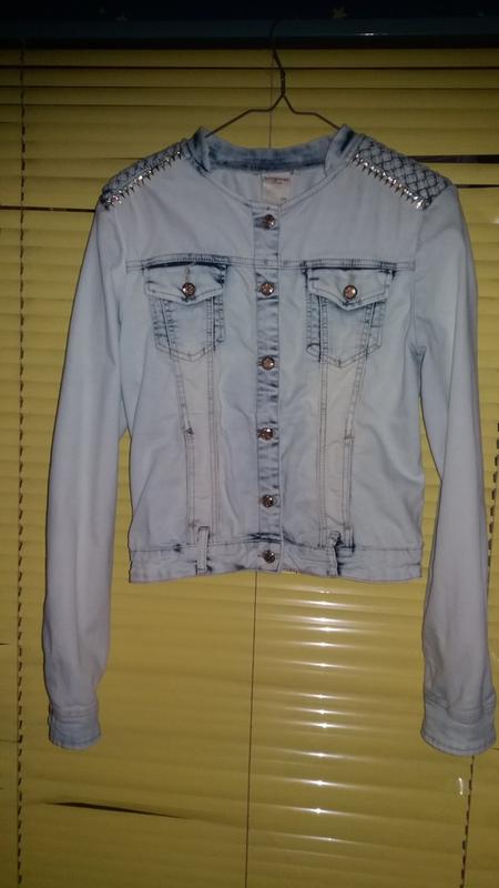 Крутая джинсовая куртка.Размер m-l /44/46 Состав:75,5 см коттон.23% полиестер.1,5% еластан. Длина рукава от плеча 68 см.манжет можно подвернуть. Длина по спинке 47 см.Ширина под мышками 47 см.