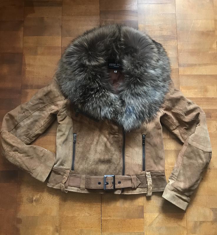 Італійська шкіряна куртка,замшева,дуже м'яка,на підкладці{фото 6}.Хутряний комір відчіплюється {фото 5 та ж модель тільки синя}.Розмір XS/S залишилася одна.Ззаду металевий логотип HE-HumanEvolution.Пог-43-44;Піт-39;довжина-53 і довжина рукава 60см.