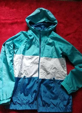 Легенька вітровка балонова без підкладки.Розмір М.Довжина 61рукав,71, груди 50.Капішон не знімається