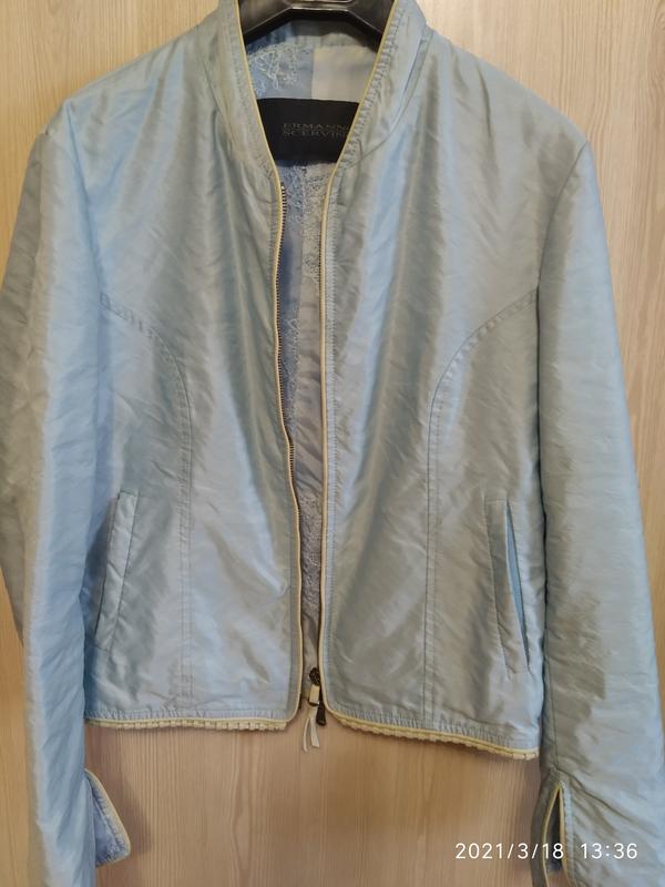 куртка бомбер летняя бу, оригинал от бренда ERMANNO SCERVINO италия, р. 40-42, нежно- голубого цвета, лёгкая , летом под любой стиль на прохладную погоду, внутри ажурная подкладка,края отделаны кожей.