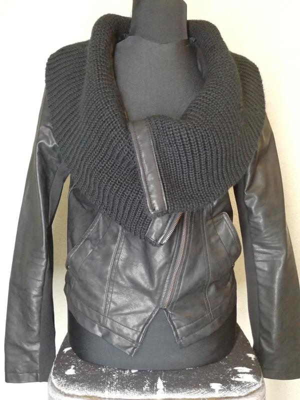 Куртка-косуха с плетеным воротником. Карманы закрываются на кнопку. Дорога фурнитура, очень качественная эко кожа. Вставка на рукаве рибана.