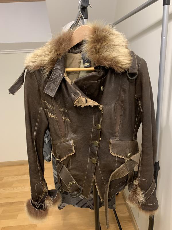 Кожаная куртка с мехом демисезонная. Металлические пуговицы и пояс, косуха