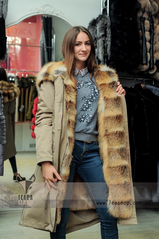 Длинная меховая парка хаки | натуральный мех лисы