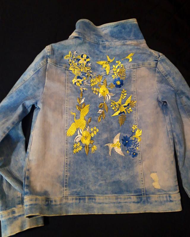 джинсовая куртка с вышивкой.Одевалась один раз.Длина 48см,пог 36см,рукав 54(можно закатать),плечи 36-37см