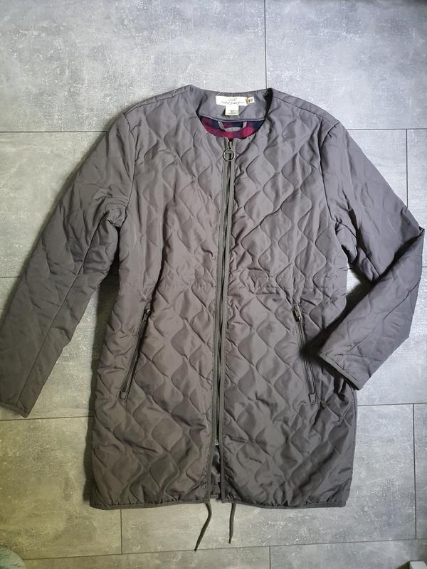 Стеганая куртка серого цвета. Легкая. Без ворота. На молнии. Не плотная. С врезными карманами на молнии. Имеет утяжку на талии. Ткань под плащевку. Длинный рукав. Прямого кроя. Для индивидуальной носки требуется химчистка. Замеры: Длина изделия 84 см. Плечи 43 см. ПОГ 51 см. ПОТ 52 см. ПО внизу 52 см. Длина рукава 61 см. Состав: 100% полиэстер. Оплата на карту приват банка и доставка новой почтой.