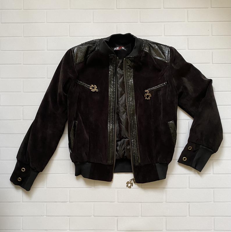 Утеплённый (стёганный внутри) модный бомбер из микровельвета. Красивые застёжки в виде черепах. Есть вставки из лака.