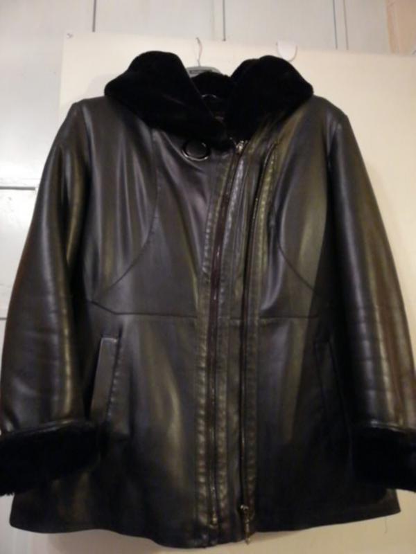 Очень теплая куртка.Прекрасно зимой. Эко кожа визуально не отличить от натуральной. Толстый мех под мутон по всей внутренности и в капюшоне и в рукавах. Глубокий капюшон.Можно отвернуть как высокий воротник-хорошо закрывает шею.Есть две молнии: застегнув на первую,изделие сидит по фигуре, на вторую -свободнее и ровно(если хотите пододеть еще теплую вещь).Износ минимален,все целое и чистое. Длина 71 см рукав от плеча 64 см(делала манжет на 5 см) пог 53 см ( можно застегнуть на первую молнию ,будет по фигуре) пот до 49 см поб до 60 см