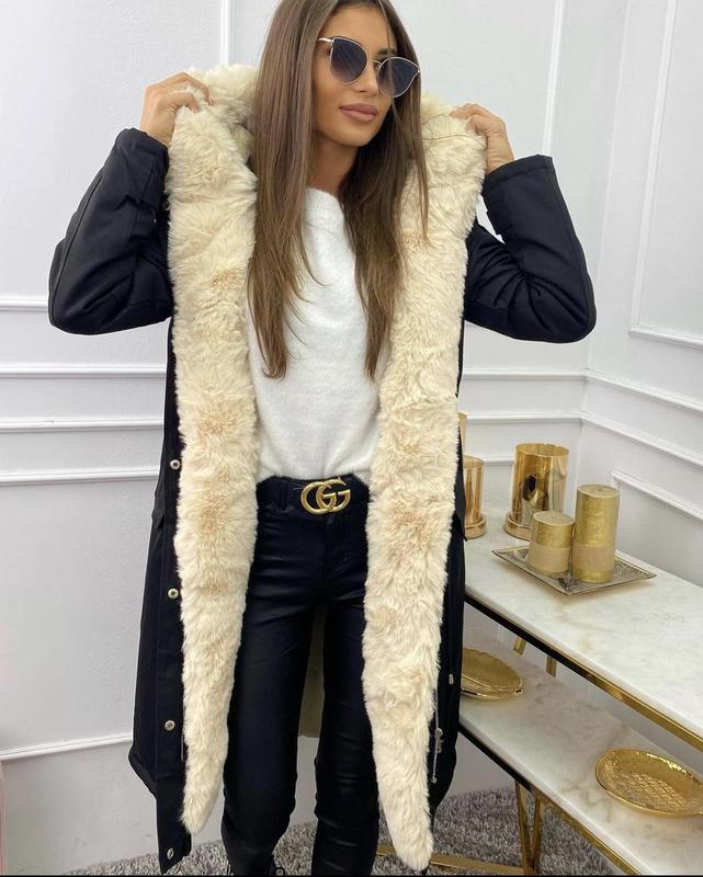 Куртка парка женская зимняя черная длинная с бежевым мехом