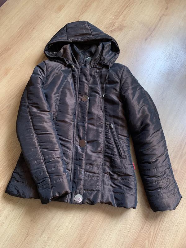 Куртка коричневого кольору, на замку і з кнопками, капюшон не відщіпається, утеплена