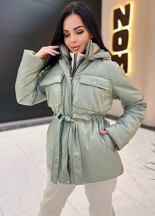 Виробник: Larionoff Склад: 95% поліестер, 5% еластан Новиночка. Зимова тепла курточка із еко-шкіри. За рахунок матеріалу абсолютно не продувається і не промокається. Якісна металева блискавка. Знімний Капюшон на кнопках. Утеплювач силікон 200. Температурний режим до -15 Розмір: 42-44 (ще може бути 46-48, запитуйте).