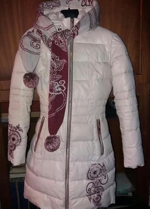 Теплий. 42 - 44р. Довжина 83 див. Рукав 60 див. Шарф відстібається від капюшона.