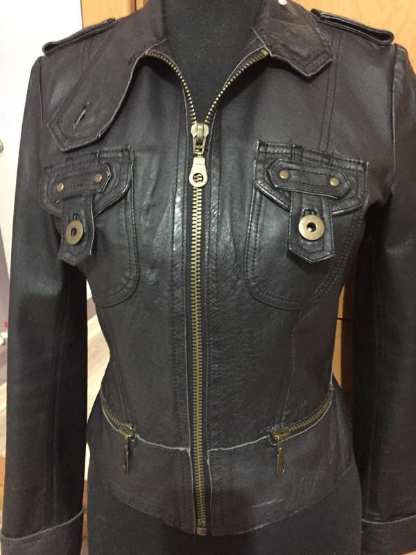 Стильная кожаная курточка на осень/весну, удобно застегивается спереди на молнии, карманы спереди придают объёма в груди, зауженная в талии, подчёркивает фигуру, а не "весит" на теле.Сзади на спине внизу есть небольшой дефект в виде потертости. Точная S-ка . Очень приятный и качественный материал