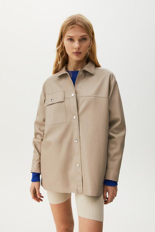 Куртка-рубашка из искусственной кожи. Длинные рукава, передний карман, классический воротник. Застегивается на кнопки.