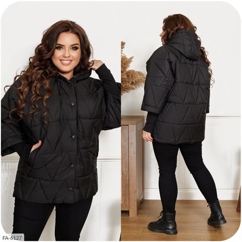 код 3416 Розміри: 48-50, 52-54, 56-58, 60-62, 64-66 Тканина:плащовка+силикон150+підклад(якісний-прінтованний) Колір: чорний, жовтий, білий, пудра, фіолетовий, блакитний Довжина куртки: 77,79,81,82,84 см Довжина рукава від горло: 71,73,75,77,79 см Обхват рукава: 46,48,50,52,54 см Виміри готового виробу: 48-50 ог 130 від 120 про 114 52-54 ог 138 від 128 про 122 56-58 ог 146 від 136 про 130 60-62 ог 154 від 144 про 138 64-66 ог 162 від 152 146 про Неймовірно стильна куртка з оригінальною стежкой трикутниками. Силует – «летюча миша». Рукав з основної тканини довжиною три чверті, доповнено оригінальними манжетами з рибаны (в'язане полотно гумкою 2*2). Куртка застібається на блискавку, поверх якої клапан на кнопках. Спереду оброблено прорізні кишені. Сезон – весна/осінь.