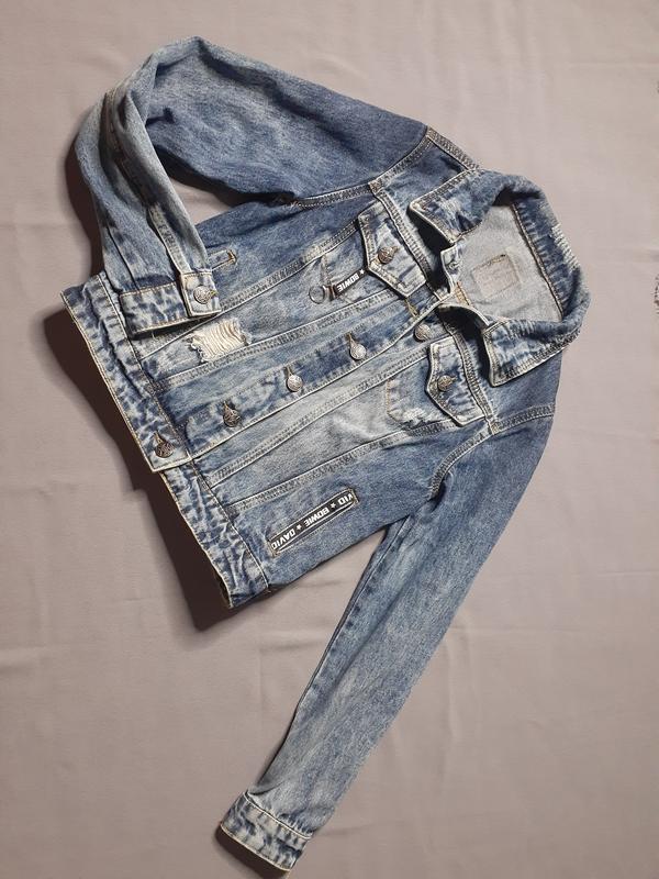 джинсовка, стильная, равная с потертостями, длина 45, ширина 41, плечо 9, рукав 57