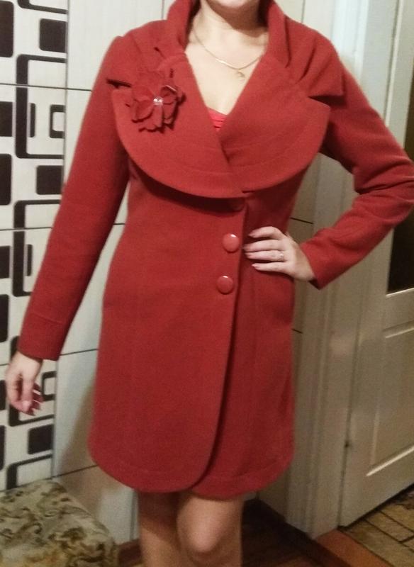 Яркое демисезонное пальто красно-оранжевого цвета,украшенное красивой брошью-цветком. Отлично стройнит фигуру .Наш размер 48. ПОГ 47 см, ПОБ 54 см, длинна 90 см Застёгивается на 3 больших пуговицы. Есть 2 внешних кармана. Гарантировано останетесь довольны!