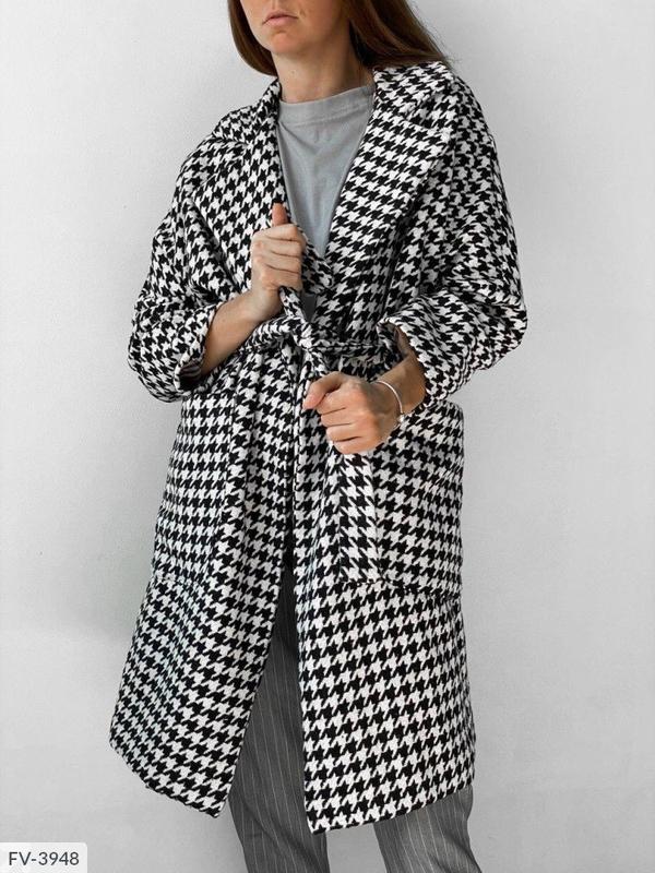 Пальто Розмiри: 42-46 Цiна розн: 1170 грн. Пальто ( фото в живу ) Тканина турецький Кашемір Пальто йде на підкладці Принт гусяча лапка Довжина 91 см Довжина рукава від коміра 71 см