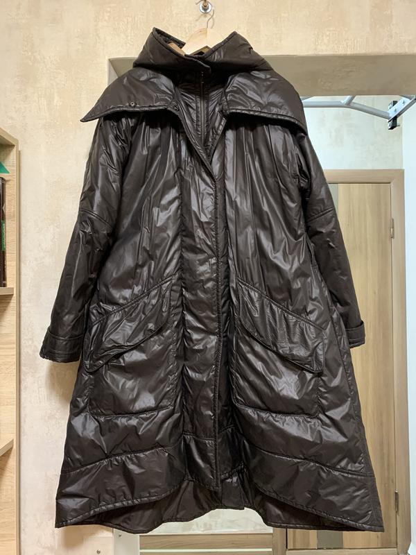 Шила пальто на заказ в ателье. Водонепроницаемое, с тонкой синтепоновой подкладкой. Пальто формы колокольчик, есть ещё пояс, тогда будет подчеркивать талию. Стиль его специфический, с огромным капюшоном в котором утопает голова, острый воротник, который можно поднять и зафиксировать. Спереди два больших кармана. Материалы покупались дорогие. Итальянская плащевка цвета черного шоколада, молния ykk.