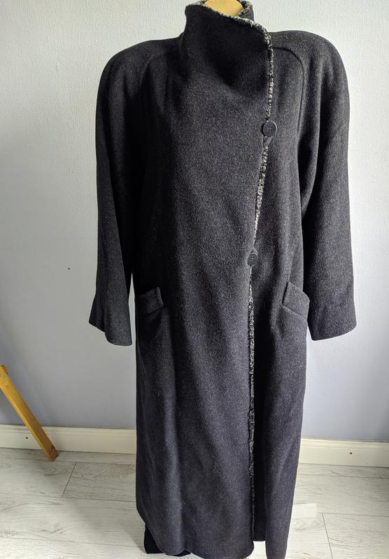 Довге пальто оверсайз, темно-сірого кольору, рукава- реглан, с внутрішньою окантовкою з штучним хутром, розмір европейський 38 (англійський 10), заміри: довжина - 122 см, ПОГ - 56 см, ПОБ - 65 см, довжина рукава від края горловини - 65 см, висота шліци - 60 см. ПОВЕРНЕННЯ та ОБМІНУ ТОВАРУ НЕМАЄ!.